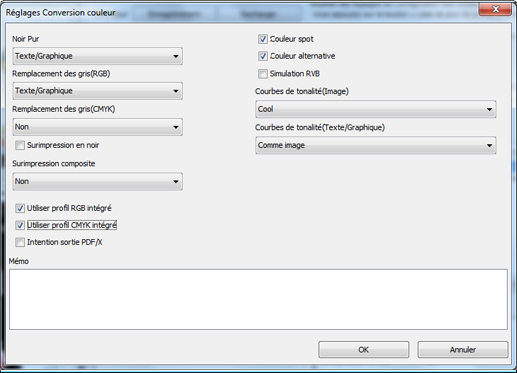 • Explication supplémentairePour utiliser des couleurs alternatives, sélectionnez une table dans Table de couleurs alternatives.