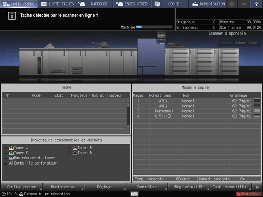 En cas de détection de traces de poudre de papier ou de poussière à éliminer sur le scanner 1 ou le scanner 2 intégré de l'optimiseur Color Care intégré IQ-501, un des messages suivants s'affiche dans la zone de message de l'écran et la machine s'arrête.