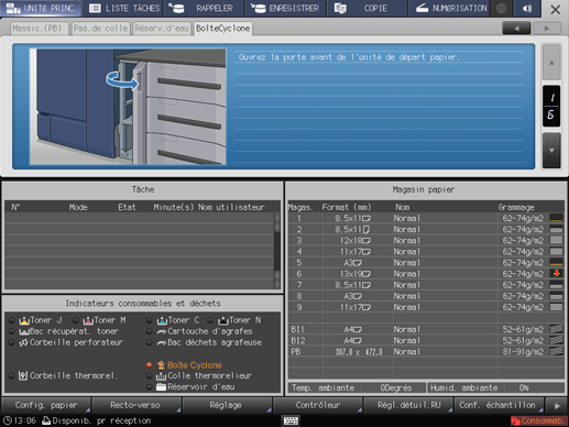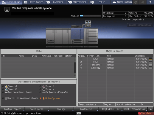 L'indicateur de boîte Cyclone vous informe également que la boîte doit être remplacée en s'allumant en jaune dans la zone Indicateurs consommables et déchets de l'écran UNITÉ PRINC.