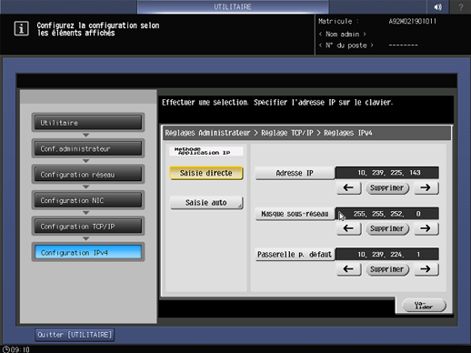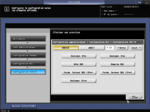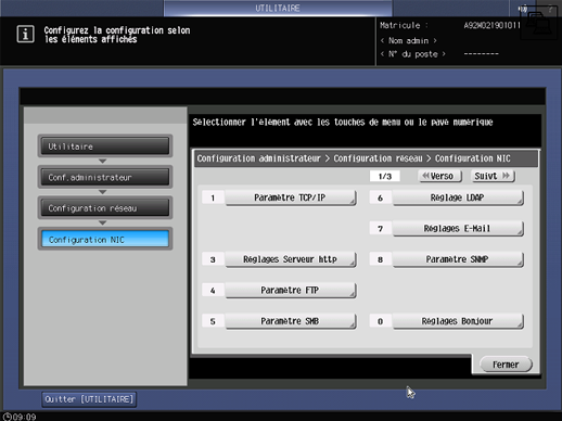 Appuyez sur Configuration réseau sur l'écran Menu Configuration administrateur et appuyez sur Configuration NIC.