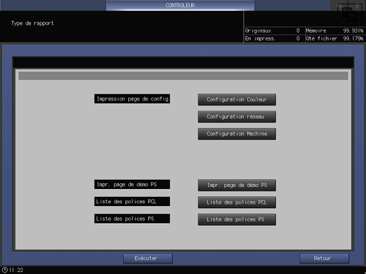 Configuration réseau,Paramètres Machine,Impr. page de démo PS,Liste des polices PCL,Liste des polices PS