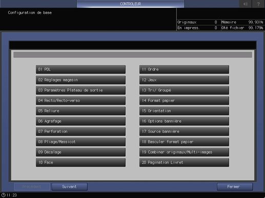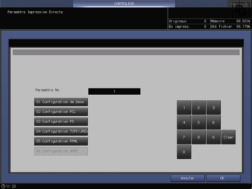 Cet écran s'affiche si vous sélectionnez Paramètre Impression Directe - Configuration de base sur l'écran Menu Configuration Contrôleur Machine. Pour en savoir plus sur l'affichage de l'écran Menu Configuration Contrôleur Machine, voir Présentation du contrôleur.