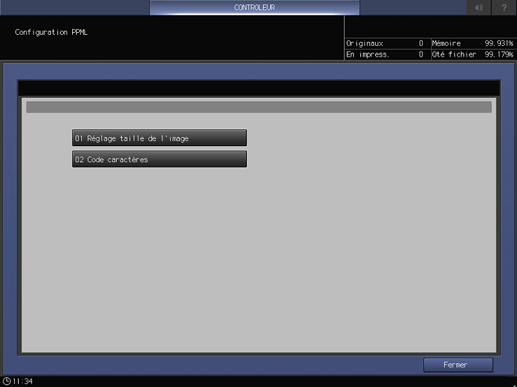 Cet écran s'affiche si vous sélectionnez Paramètre Impression Directe - Configuration PPML sur l'écran Menu Configuration Contrôleur Machine. Pour en savoir plus sur l'affichage de l'écran Menu Configuration Contrôleur Machine, voir Présentation du contrôleur.