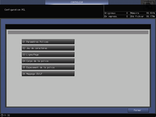 Cet écran s'affiche si vous sélectionnez Paramètre Impression Directe - Configuration PCL sur l'écran Menu Configuration Contrôleur Machine. Pour en savoir plus sur l'affichage de l'écran Menu Configuration Contrôleur Machine, voir Présentation du contrôleur.