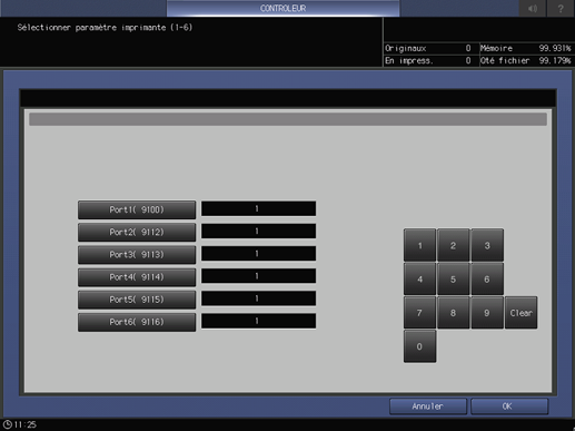Port1(9100) à Port6(9116) | Spécifie la sortie de chaque port (numéro de paramètre 1 à 6). Entrez un numéro de port et appuyez sur Valider. Pour annuler la modification, appuyez sur Annuler. |