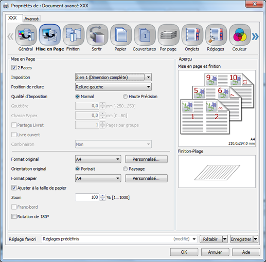 Lors de la configuration du pilote d'imprimante, assurez-vous d'avoir supprimé les réglages précédents des différents éléments des onglets Mise en Page, Finition, Couvertures, etc.