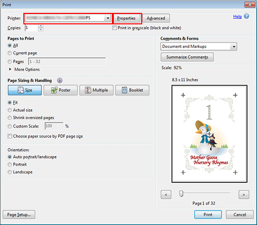 Sélectionnez l'imprimante à utiliser pour l'impression et cliquez sur Propriétés.