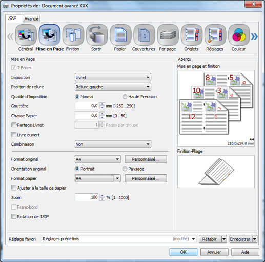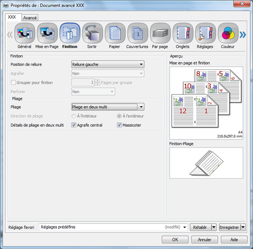 Cliquez sur l'onglet Finition, définissez Pliage et Détails de pliage en deux multi.