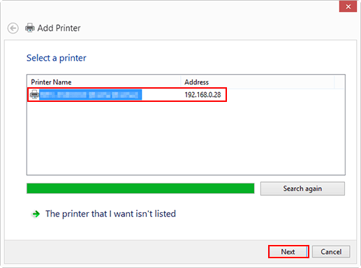 Dans la fenêtre indiquant les résultats de la recherche, cliquez sur L'imprimante voulue n'est pas dans la liste.