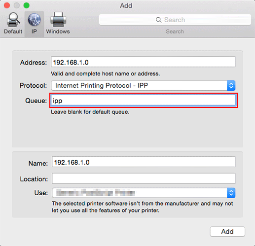 Dans Address :, entrez l'adresse IP de la machine. Dans Queue, entrez ipp.