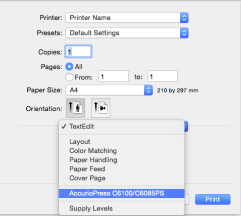 Sélectionnez AccurioPress C6100/C6085PS dans le menu déroulant de la boîte de dialogue et cliquez sur Set.