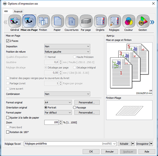 Insérer des pages vierges pour la couverture du livret | Non, Oui | Insère une page vierge pour imprimer la dernière page sur la couverture verso d'un livret lorsque le nombre total de pages n'est pas un multiple de 4 en mode livret. |
