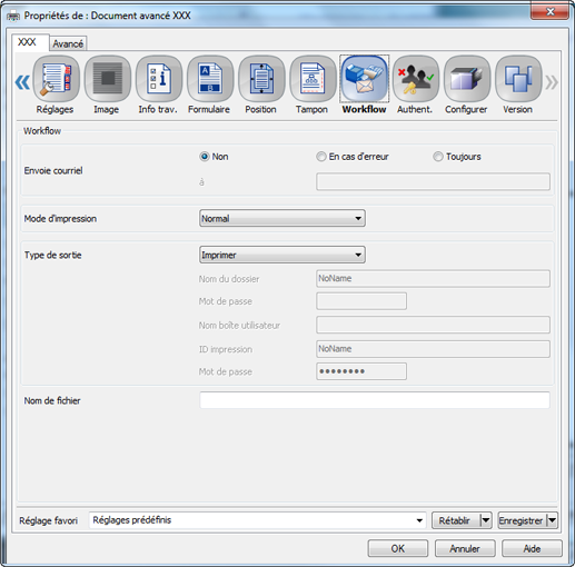 Méthode de sortie | Imprimer, Impr/En attente, En attente, En attente (sans RIP), Imprimer/enreg. sur DD, Enregistrer sur DD, Impression sécurisée, Formulaire | Sélectionnez la méthode d'exécution d'un travail d'impression à envoyer de l'ordinateur vers la machine. Si vous sélectionnez la méthode Imprimer/Enregistrer en disque dur, Enregistrer en disque dur ou Impression sécurisée, vous devez entrer le Nom du dossier, le Mot de passe, le Nom boîte utilisateur, l'ID impression et le Mot de passe. Pour en savoir plus sur En attente et En attente (sans RIP), voir Mise en attente des tâches. Pour en savoir plus sur Imprimer/Enregistrer en disque dur et Enregistrer en disque dur, voir Enregistrement d'une tâche sur le disque dur. Pour en savoir plus sur la fonction Impression sécurisée, voir À propos de l'impression sécurisée. Pour en savoir plus sur Formulaire, voir À propos du formulaire. |