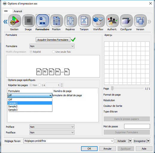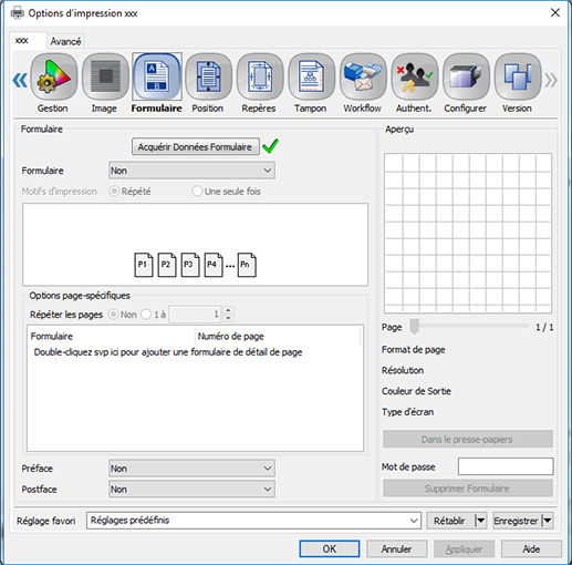 Explication supplémentaireRépété : surimpose un formulaire sur toutes les pages d'une tâche pour en répéter l'impression. Vous ne pouvez définir qu'une ou deux pages dans un formulaire.