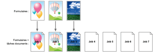 Quand un formulaire comprend deux pages, la page de formulaire 1 est assignée à la première page de la tâche, la page de formulaire 2 à la seconde page du travail et la page de formulaire 1 est réassignée à la troisième page comme sur l'illustration ci-dessous. Ce motif se répète.