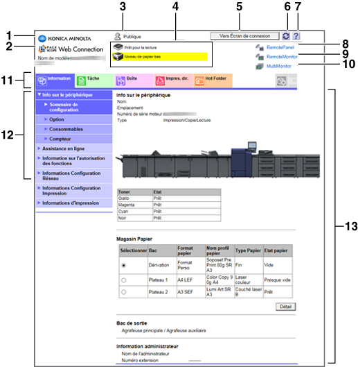Après la connexion à PageScope Web Connection, l'écran qui s'affiche est comme celui illustré ci-dessous. L'écran suivant est un exemple d'écran affiché lorsque Info sur le périphérique est sélectionne sous l'onglet Information.