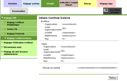 Pour afficher cet écran, cliquez sur Réglages PKI - Réglage Certificat Externe dans le menu de l'onglet Sécurité.