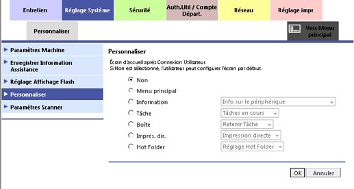 Selon votre environnement de travail au bureau, spécifiez un écran de démarrage approprié en vue d'optimiser l'efficacité de l'utilisateur. Par exemple, si vous utilisez fréquemment la fonction Impression directe sur la machine, vous pouvez spécifierImpres. dir. comme écran initial.