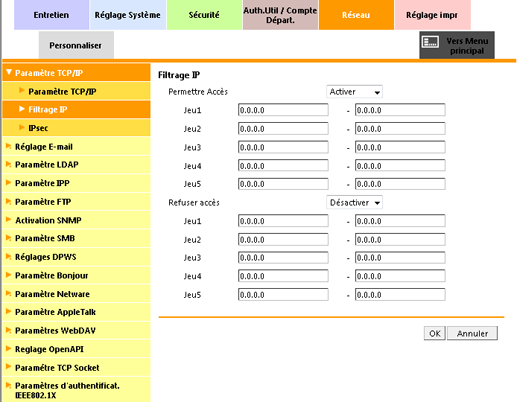 Pour afficher cet écran, cliquez sur Paramètre TCP/IP - Filtrage IP dans le menu de l'onglet Réseau.