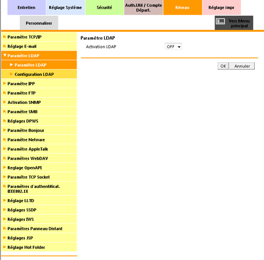 Pour afficher cet écran, cliquez sur Paramètre LDAP - Paramètre LDAP dans le menu de l'onglet Réseau.