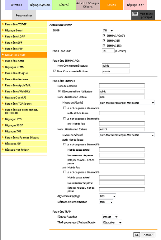 Pour autoriser l'alerte d'état de la machine au moyen de la fonction TRAP du protocole SNMP, sélectionnez Autoriser dans la liste déroulante Réglage Autoriser dans Paramétre TRAP.