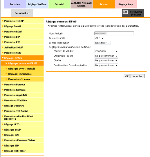 Pour afficher cet écran, cliquez sur Réglages DPWS - Réglages communs DPWS dans le menu de l'onglet Réseau. Cet écran permet de configurer les réglages en vue de détecter la machine à l'aide du service Web.