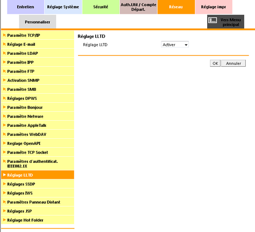 Pour afficher cet écran, cliquez sur Réglage LLTD dans le menu de l'onglet Réseau.