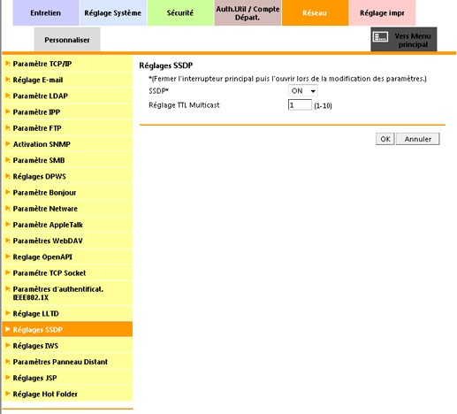Cet écran permet d'indiquer s'il faut utiliser le protocole SSDP (Simple Service Discovery Protocol). L'activation du protocole SSDP permet de trouver le service peut fournir avec le logiciel et les autres services du réseau. Pour utiliser le protocole SSDP, modifiez la résolution TTL multicast (Time To Live) comme il convient.