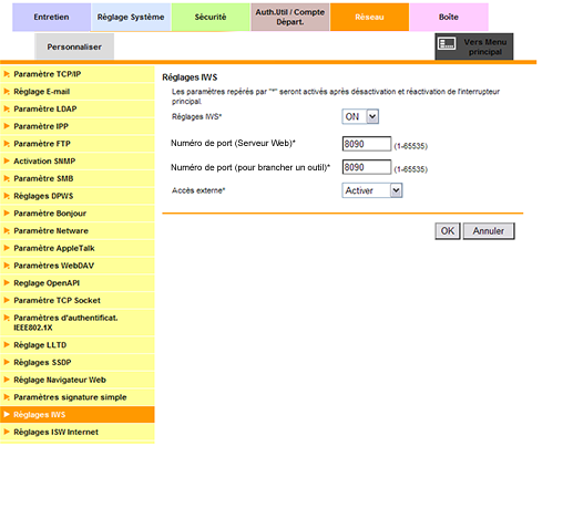 Cet écran permet de sélectionner s'il faut utiliser le serveur Web interne (IWS). L'utilisation de la fonction IWS permet de transférer une application de conversion des données d'impression dans la machine et d'utiliser la fonction de conversion des données d'impression et autres fonctions.