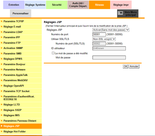 Cliquez sur Réglages JSP dans le menu de l'onglet Réseau pour afficher cet écran.