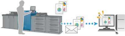 Vous pouvez envoyer des données numérisées depuis l'ADF ou de la vitre d'exposition (données numérisées) à une adresse e-mail sous forme de fichier joint.