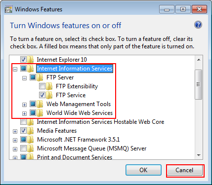Cliquez sur Internet Information Services et Service FTP et cliquez ensuite sur OK.