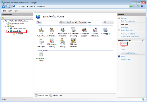 Sélectionnez le site FTP et cliquez ensuite sur Redémar.