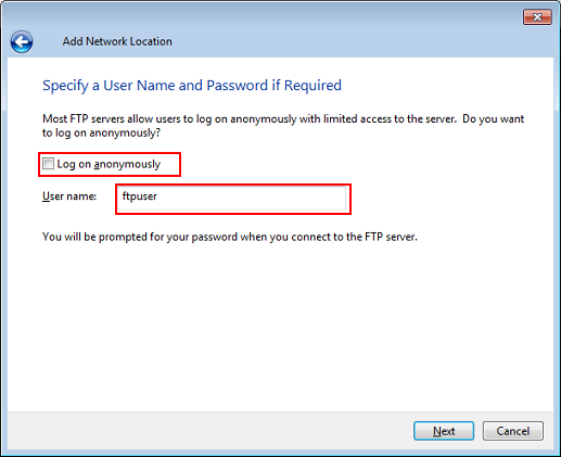 Décochez Ouvrir une session anonyme et entrez le nom d'utilisateur et cliquez ensuite sur Suivant.