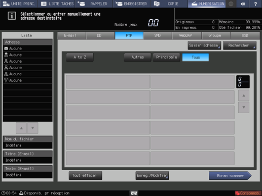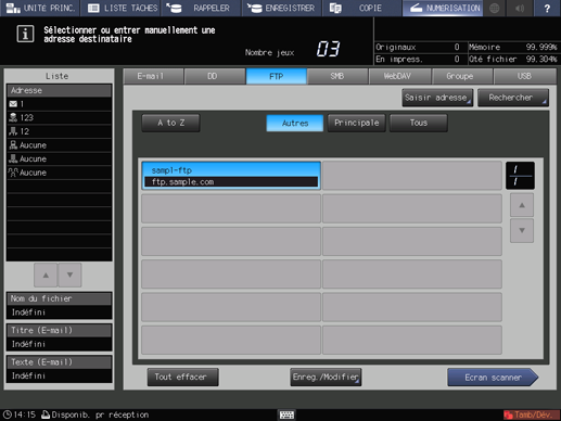 Sélectionnez l'adresse FTP que vous avez enregistrée et appuyez sur Ecran scanner.