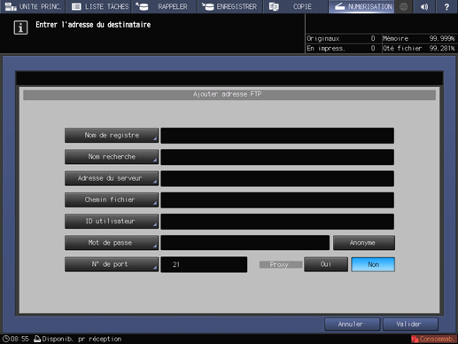 Enregistrez le site FTP de destination sur l'écran tactile de la machine.