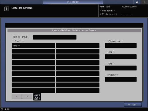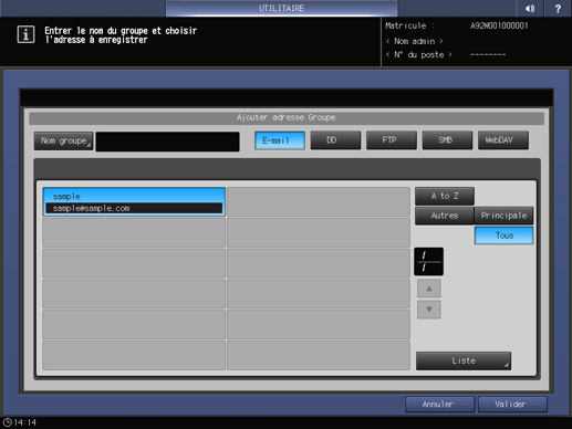 condition préalableVous pouvez enregistrer plus d'une destination par groupe pour l'envoi d'e-mails. Vous ne pouvez enregistrer qu'une destination dans un groupe de chacun des éléments DD, FTP, SMB et WebDAV.