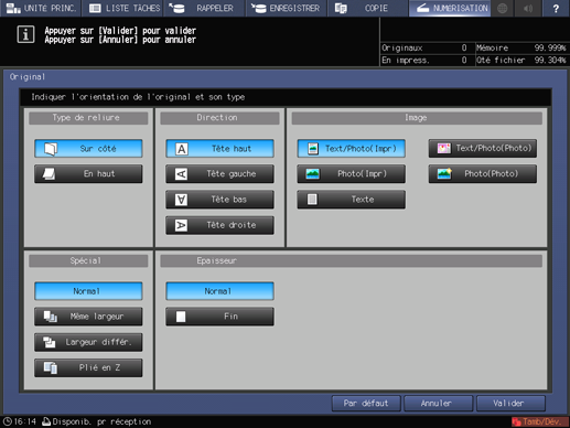 Vous pouvez définir la numérisation séparée, le type de reliure d'un original recto-verso (haut et bas des deux faces identiques ou inversion verticale d'une face), l'orientation de l'original et le type d'original.