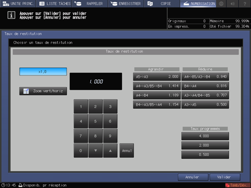 Sélectionnez le taux de restitution qui convient dans les valeurs enregistrées dans Utilitaire/Compteur - Config. utilisateur - Configuration système - Taux de restitution.