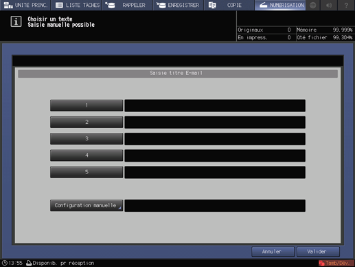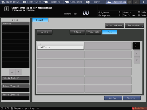 Appuyez sur Valider à l'écran Saisie option E-mail pour retourner à l'écran NUMÉRISATION.