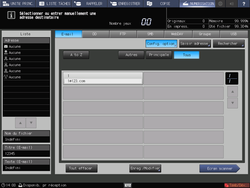 Explication supplémentaireLa liste des adresses e-mail est affichée par défaut. Pour en savoir plus sur l'onglet Destination par défaut de l'écran NUMÉRISATION, voir [Config. administrateur] : [Configuration de la numérisation].