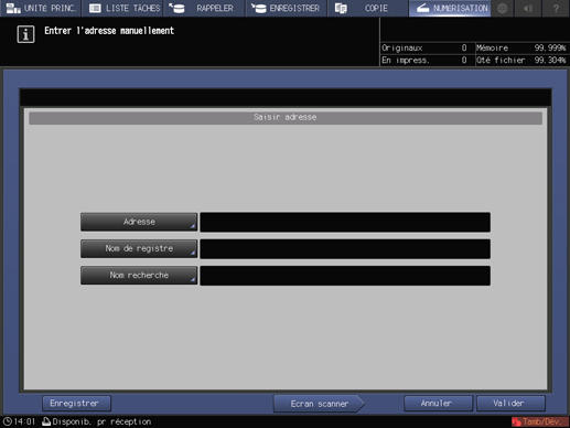 Explication supplémentairePour revenir à l'écran NUMÉRISATION, appuyez sur Adresse.