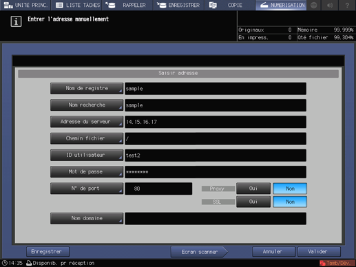 L'original est numérisé et les données numérisées sont stockées à une adresse spécifiée.