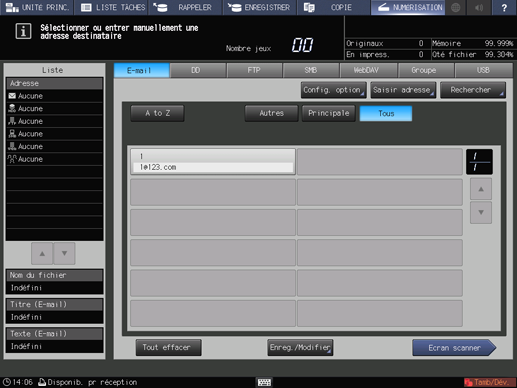 Explication supplémentaireLa liste des adresses e-mail est affichée par défaut. Pour en savoir plus sur l'onglet Destination par défaut de l'écran NUMÉRISATION, voir [Config. utilisateur] : [Configuration numérisation].