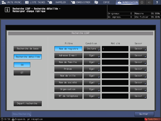Pour effectuer une recherche LDAP, la configuration LDAP est nécessaire. Pour des détails, voirOnglet [Réseau] : [configuration LDAP].