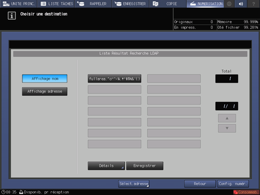 Vous pouvez acquérir les informations correspondant aux critères de recherche entrés sur le panneau de contrôle à partir de la base de données du serveur LDAP. Vous pouvez aussi sélectionner l'adresse e-mail acquise et envoyer ou enregistrer les données de numérisation.