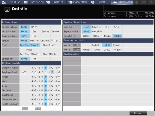 • Explication supplémentaireLes paramètres actuels de Présentation, Réglage qualité et Format numérisation du côté gauche de l'écran Contrôle.