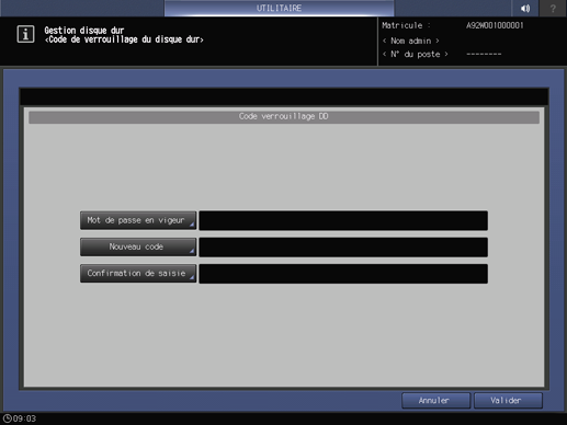 2. Appuyez sur l'onglet Configuration sécurité de l'écran Menu Réglage administrateur et appuyez consécutivement sur Gestion disque dur et Code verrouillage DD.