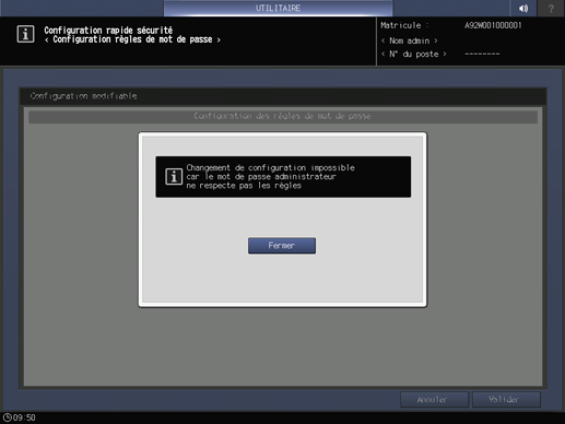 Explication supplémentaireSi vous appuyez sur Activer alors que le code administrateur par défaut n'a pas été modifié ou que le code administrateur n'est pas conforme aux règles, le refus de la sélection s'affiche dans un dialogue. Modifiez le mot de passe pour vous conformer aux règles. Pour des détails, voir[Mot de passe admin.].