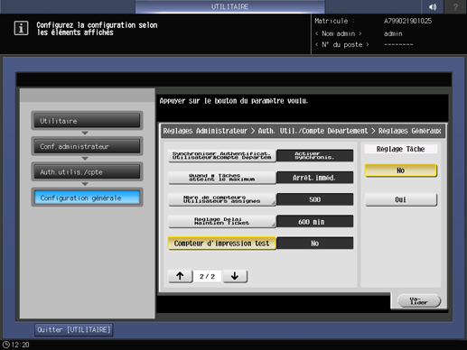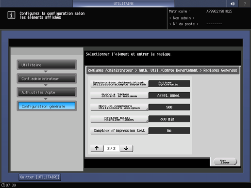 Appuyez sur l'onglet Auth.utilis./cpte de l'écran Menu conf. administrateur et appuyez sur configuration générale.